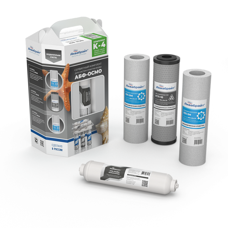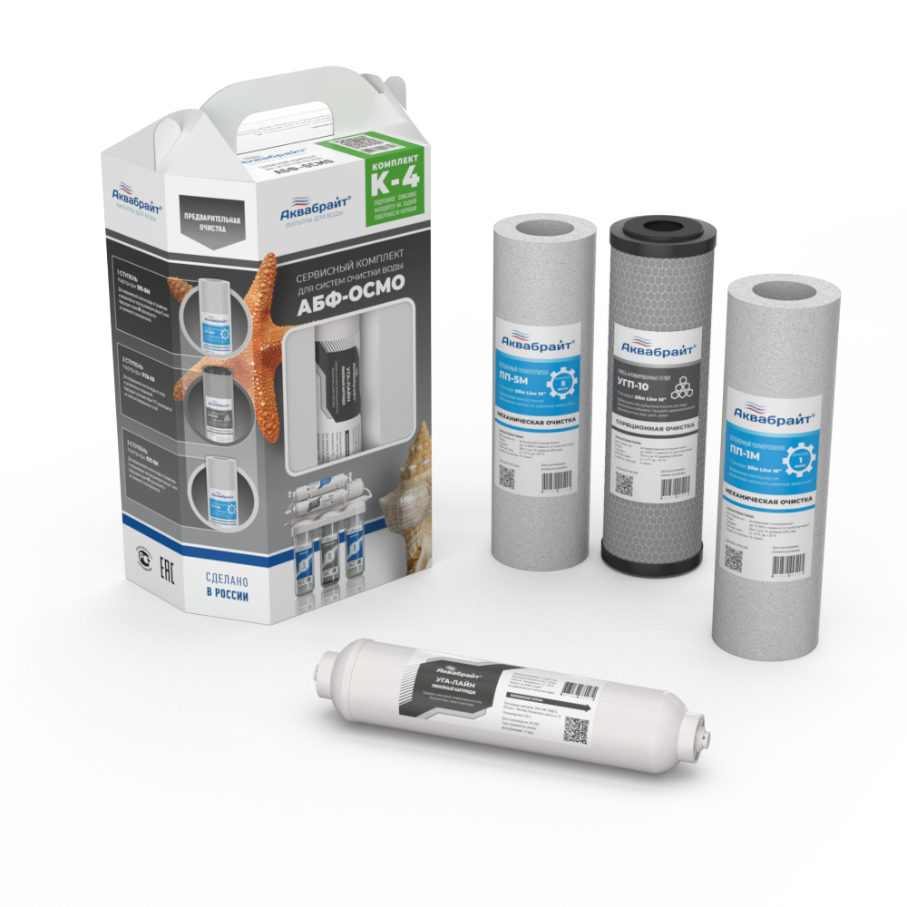 Комплект Картриджей К-4 АКВАБРАЙТ без МЕМБРАНЫ для очистки воды. Предназначен для установки в питьевые системы серии АБФ-ОСМО-5 под кухонную мойку. В комплект входят картриджи: ПП-5М, УГП-10, ПП-1 УГА-ЛАЙНТехнические характеристики