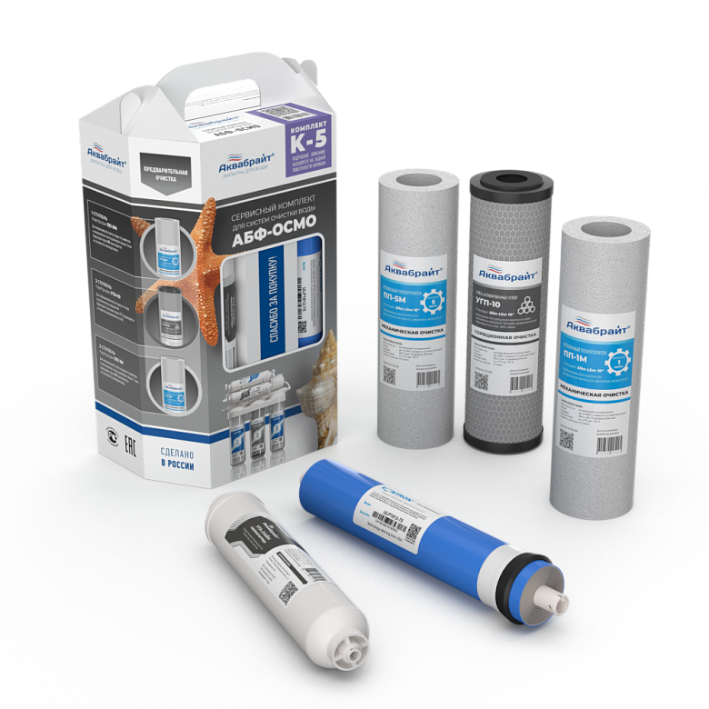 Комплект Картриджей К-5 АКВАБРАЙТ c МЕМБРАНОЙ VONTRON для очистки воды. Предназначен для установки в питьевые системы серии АБФ-ОСМО-5 под кухонную мойку. В комплект входят картриджи: ПП-5М, УГП-10, ПП-1, Мембрана ULP1812-75 VONTRON, УГА-ЛАЙНТехнические характеристики