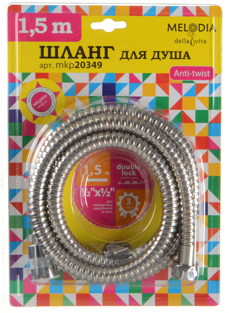 шланг д/душа MELODIA защита от перекручивания L150см 1/2"*1/2" конус нерж. d14мм 2-й зажим MKP20349B