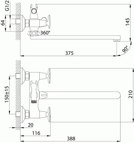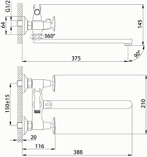 смеситель ванна ROSSINKA с поворотный изливом 350мм, дивертер керамика, RS41-84