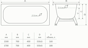 ванна стальная ВИЗ Tevro форма Сома 1500х700 (T-52902) с о/п ОР-01207