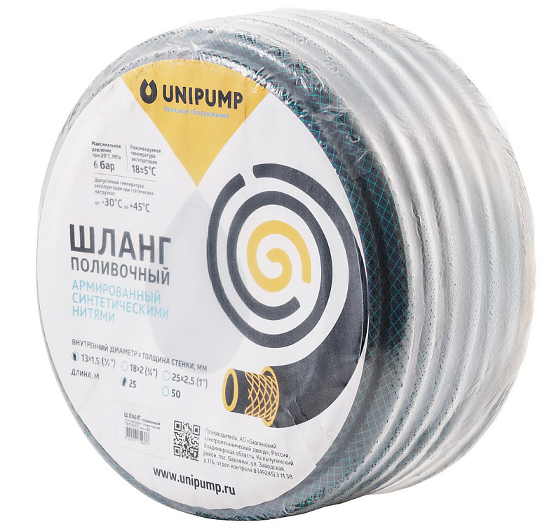 Шланг поливочный UNIPUMP — армированный синтетическими нитями, изготавливается экструзионным методом из полимерных материалов. Применяется в качестве гибких трубопроводов для подачи питьевой и технической воды. Может использоваться для бытовых нужд, в машиностроении, в пищевой, перерабатывающей и других отраслях промышленностиТехнические характеристики